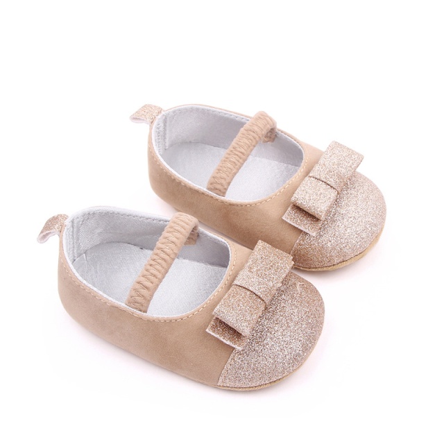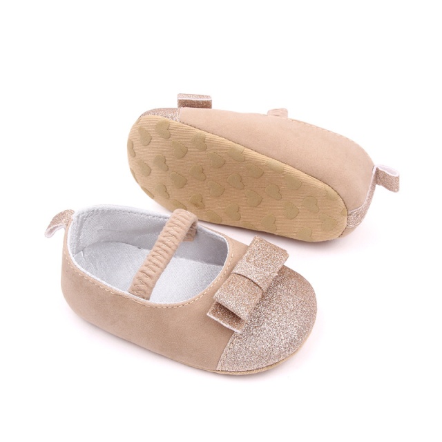 Adauga un plus de stralucire tinutei micutei tale cu acesti pantofiori crem, cu varfuri si fundite sclipitoare.