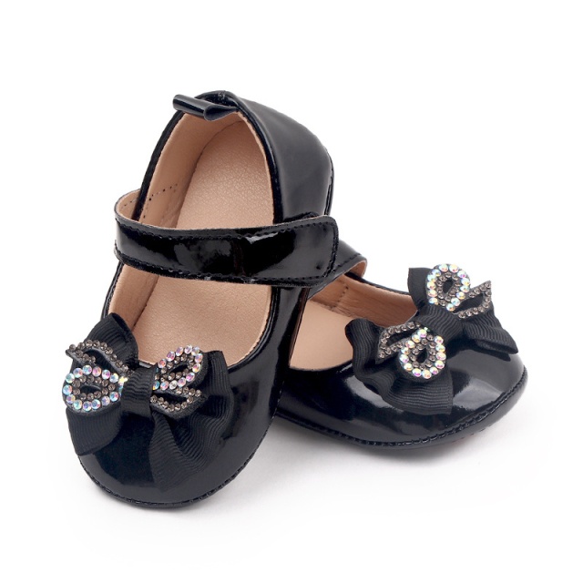 Pantofiori cu fundita cu strasuri, negri, din lac (marime disponibila: 3-6 luni