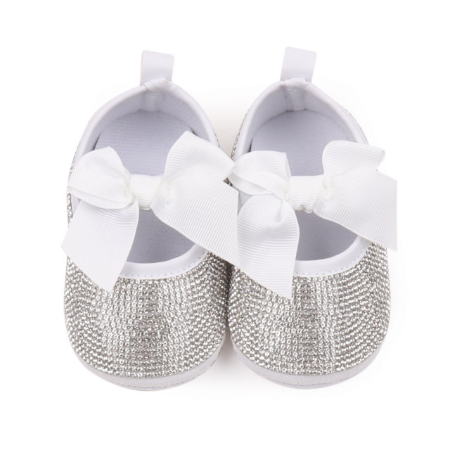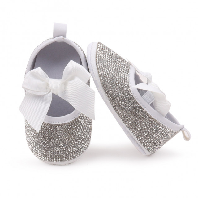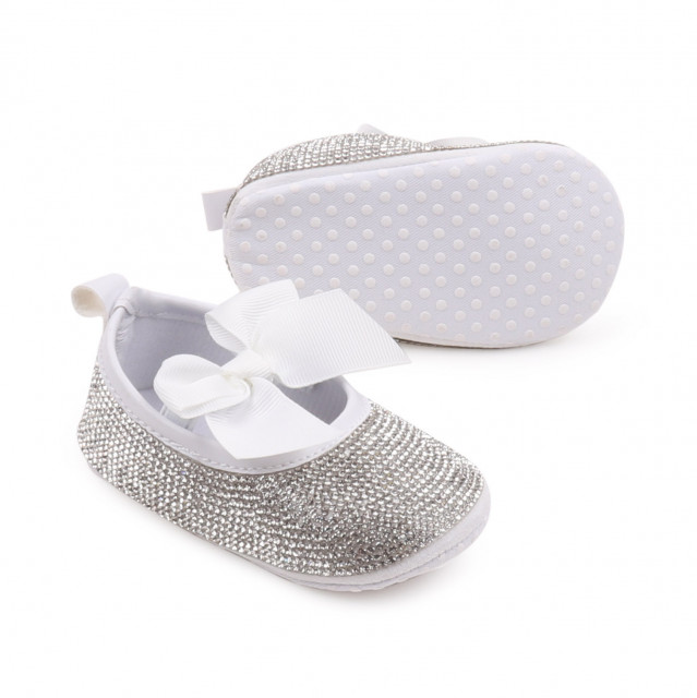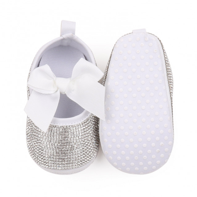 Pantofiori pentru fetite cu strasuri aplicate. Se prind de piciorus cu elastic pe care este aplicata o fundita alba pentru un plus de eleganta.