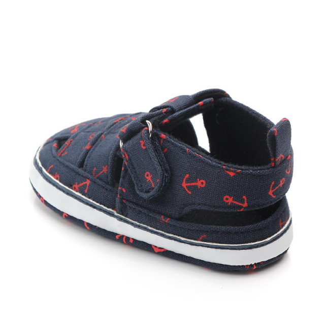 Pantofiori decupati pentru baietei, din material textil, imprimati cu ancore rosii. Se inchid cu bareta cu arici intr-o parte.