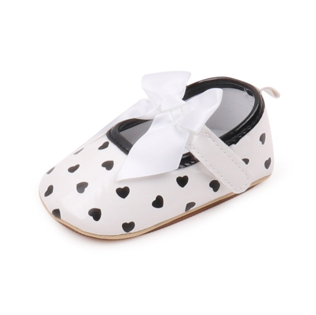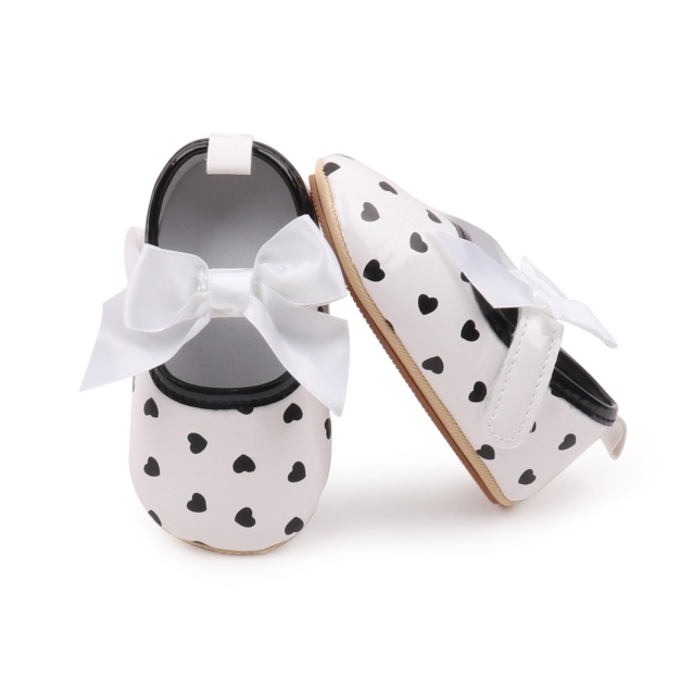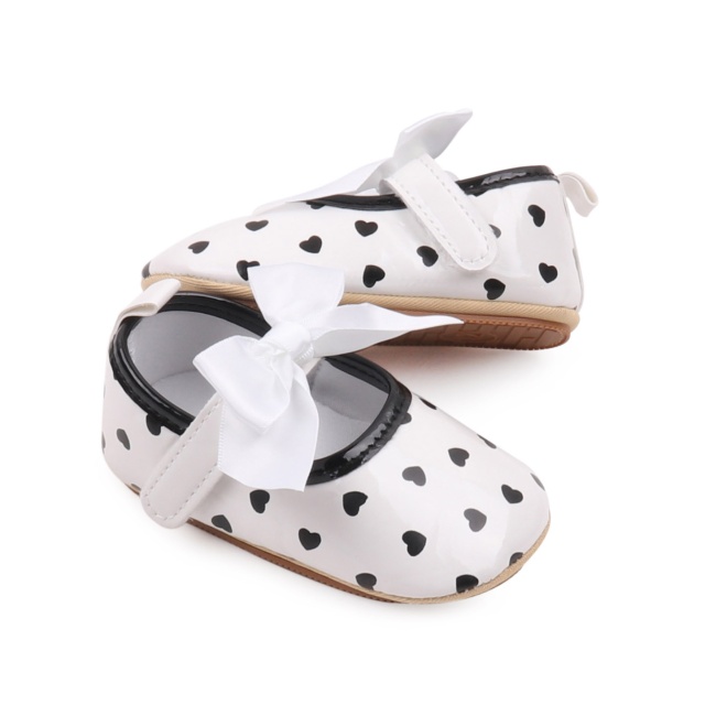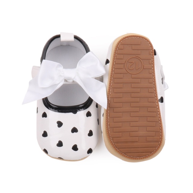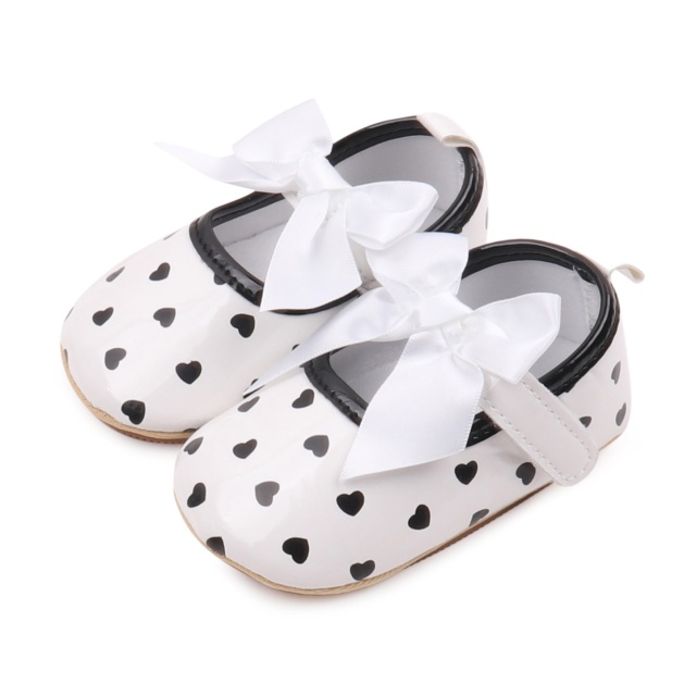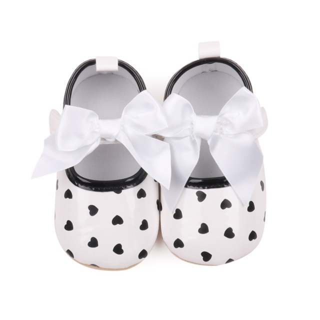 Pantofi bebelusi albi cu inimioare negre si fundita, confectionati din piele ecologica lacuita, sunt alegerea perfecta pentru micile printese.
