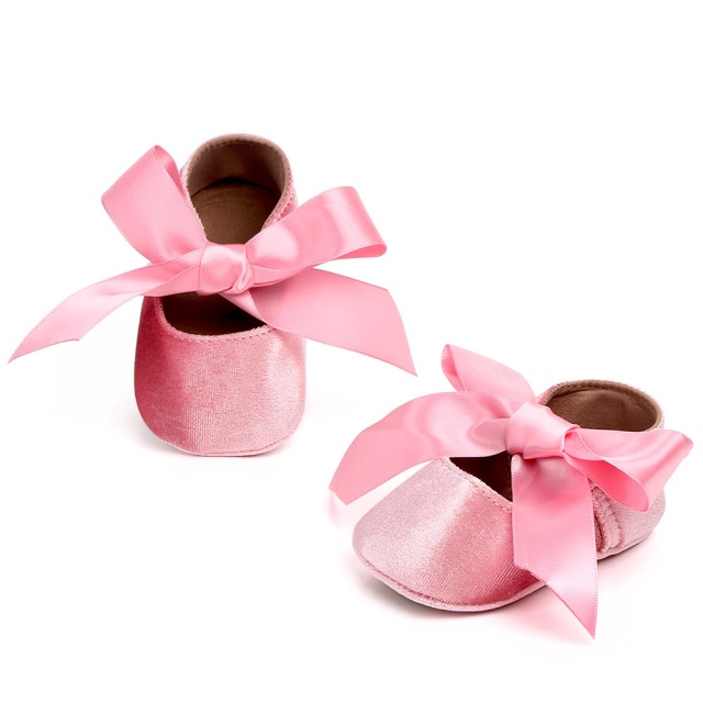 Pantofiori pentru bebelusi din material catifelat roz, decorati cu panglica din satin eleganta.