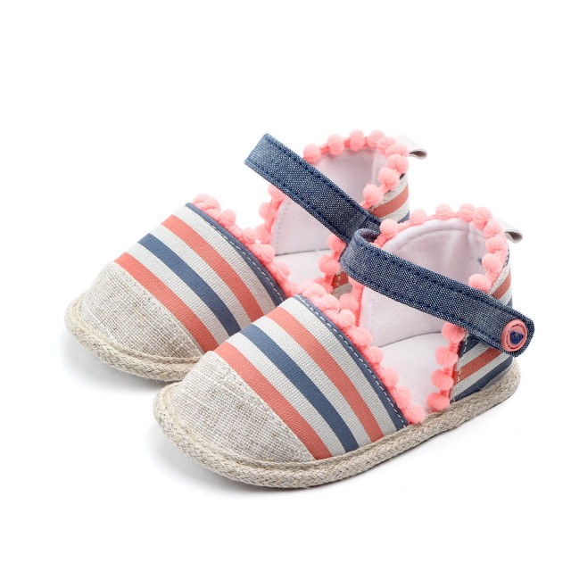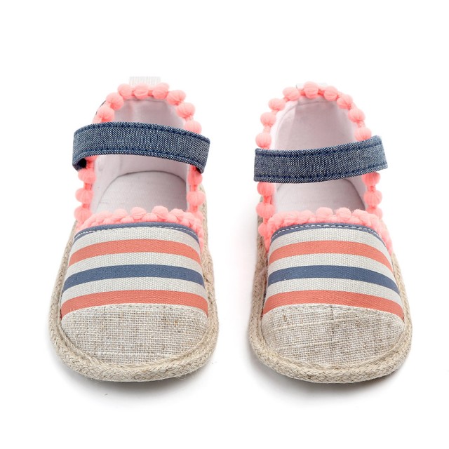 Pantofiori pentru fetite din material textil, cu dungulite colorate si ciucurasi roz aplicati pe margini. Se inchid cu bareta cu arici intr-o parte.