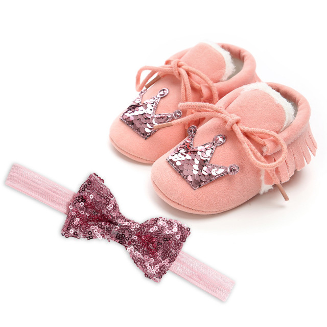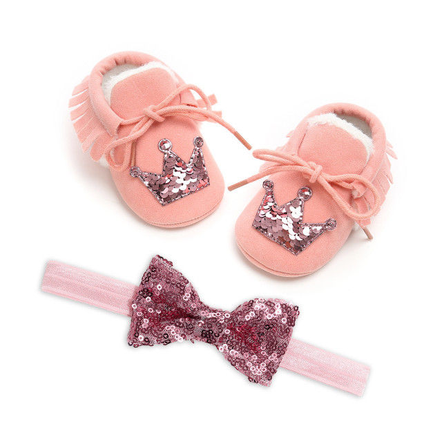 Pantofiori imblaniti roz cu bentita asortata (marime disponibila: 6-9 luni