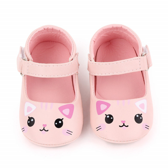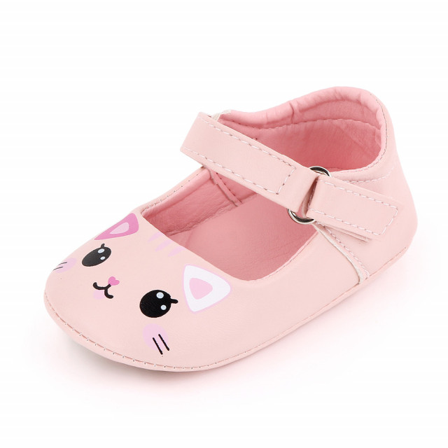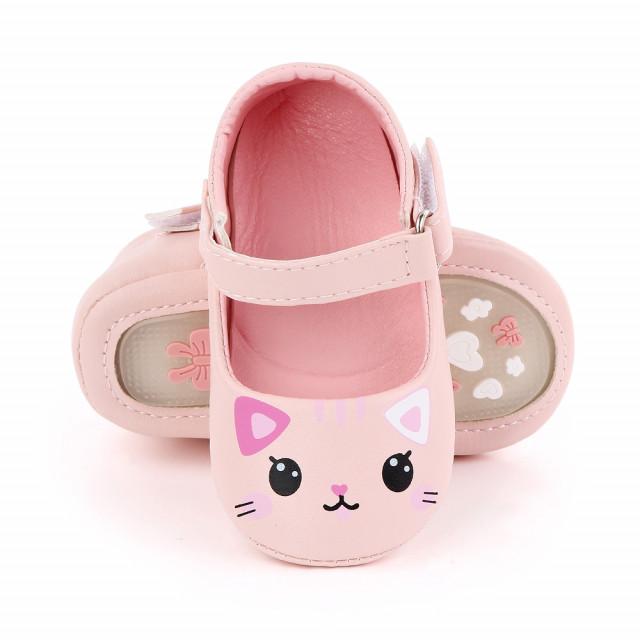 Pantofiori pentru fetite, din material tip piele ecologica, in forma de pisicuta, se inchid cu bareta cu arici intr-o parte.