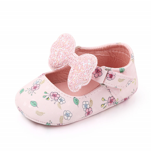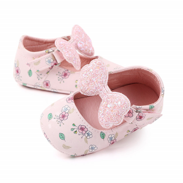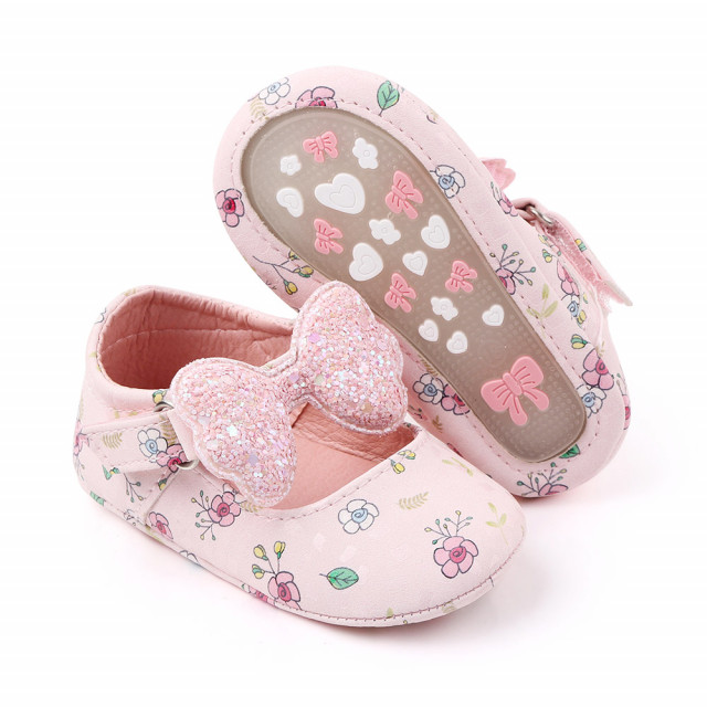 Pantofiori pentru fetite, imprimati cu floricele, cu o funda roz sclipitoare aplicata in fata. Se inchid cu bareta cu arici intr-o parte.