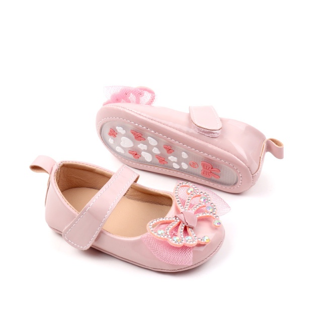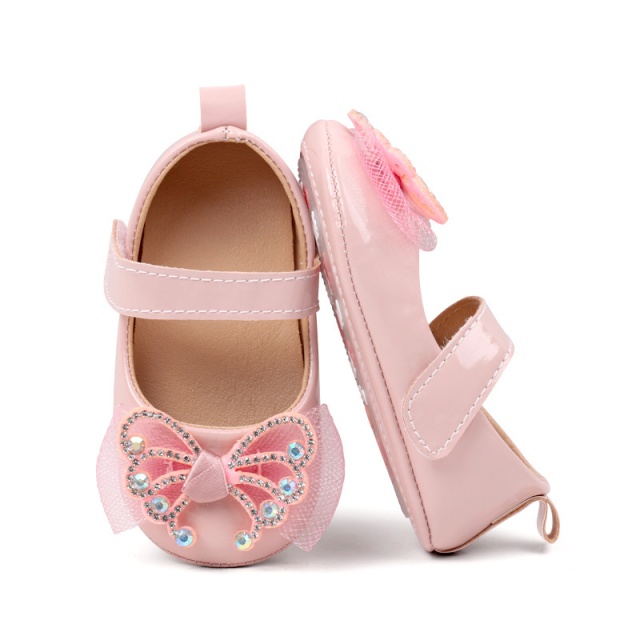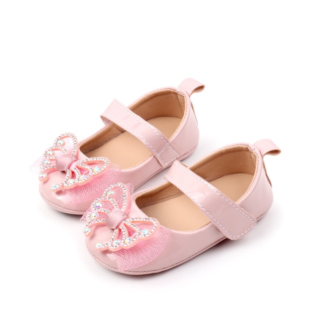 Pantofiori roz, din lac, cu fundita cu strasuri (marime disponibila: 6-9 luni