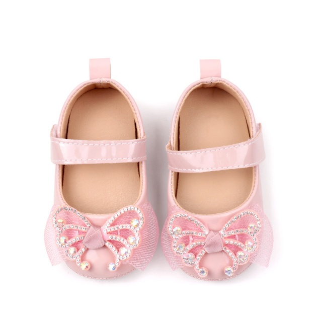 Pantofiori eleganti pentru bebelusi, de culoare roz, cu detalii decorative sub forma de fundita stralucitoare si cristale.