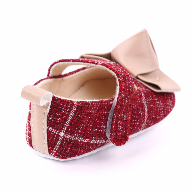 Pantofiori pentru fetite, din material textil, cu o funda crem din piele ecologica aplicata in fata. Se inchid cu bareta cu arici intr-o parte.