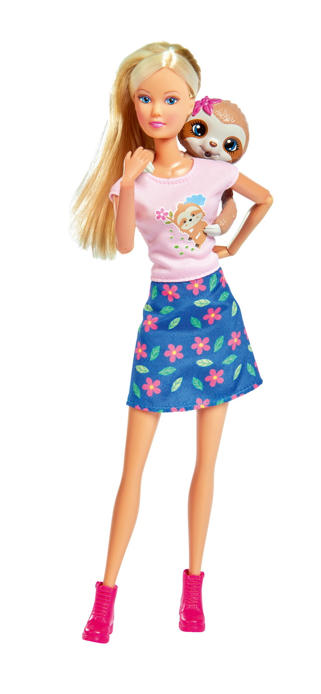 Steffi este impreuna cu lenesul ei favorit si are grija de el. Lenesul are functia bea si fa pipi iar setul include sticluta si scutec. Steffi Love este o adevarata papusa de moda. Ii plac hainele elegante, coafurile cu stil, sora ei mica Evi si bineinteles iubitul ei Kevin. Fetele isi pot stiliza si imbraca papusa in cele mai noi tendinte ale modei.