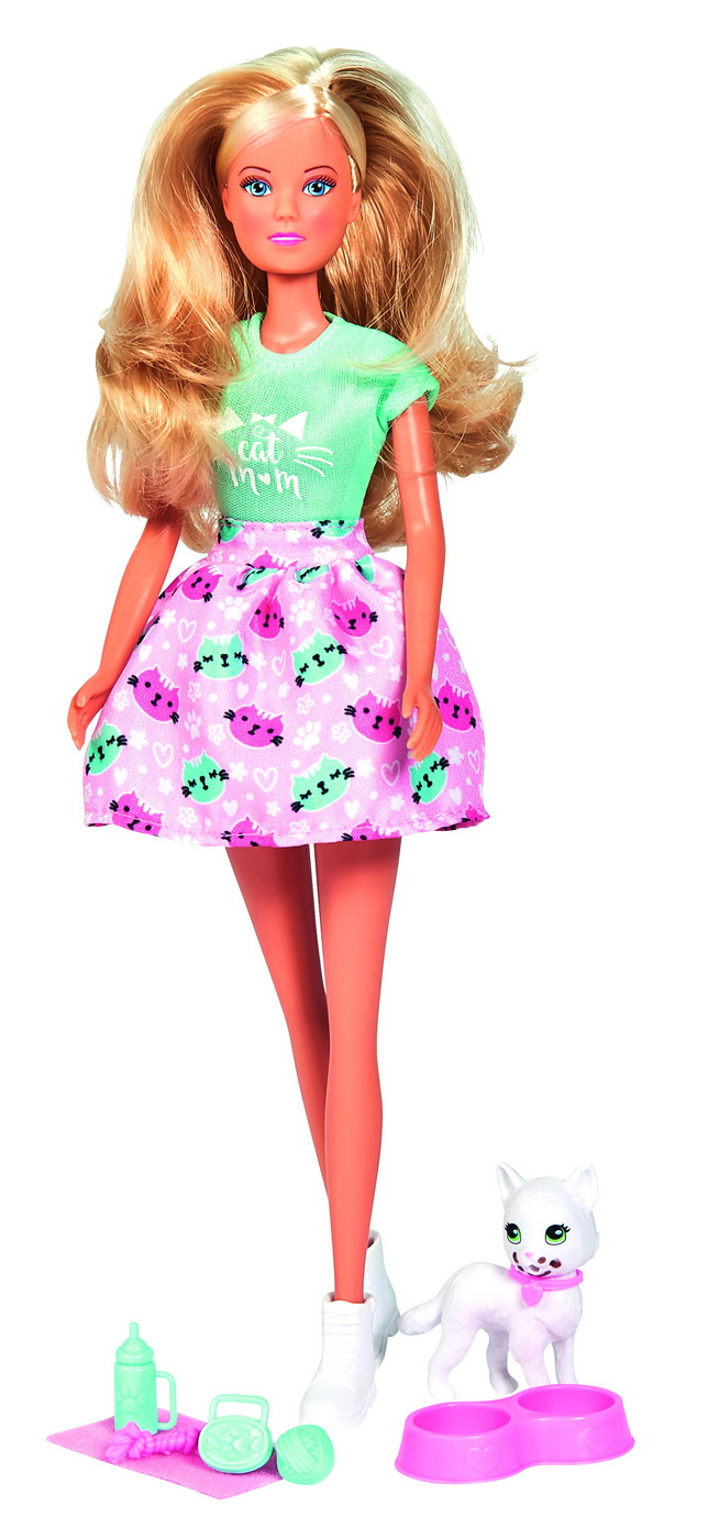 Steffi poarta o rochie la moda, si pleaca la plimbare impreuna cu pisicuta ei, plus multe accesorii, Inaltime papusa 29cm. Papusa Steffi are grija de pisicuta. Poarta o rochie verde si roz, cu pisici si pantofi albi. Pisicuta este alba si are fata murdara. Este suficient sa umeziti carpa atasata setului cu apa calda si sa stergeti gura, iar murdaria va disparea. Accesoriile pentru ingrijirea unui animal de companie includ un castron pentru mancare si apa, o minge de lana, o sticla.