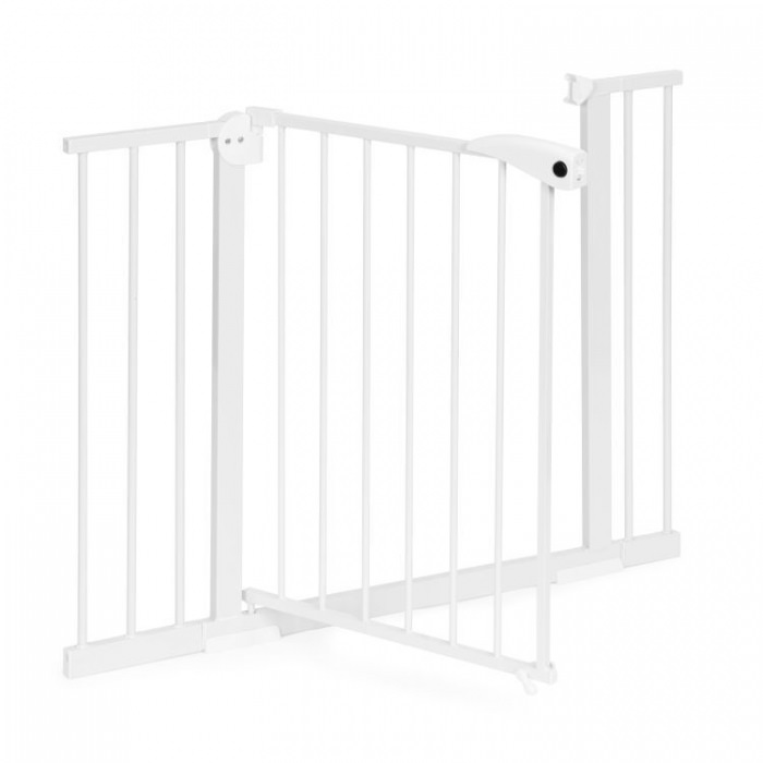 Poarta de siguranta este perfecta pentru securizarea scarilor si a usilor, blocand eficient accesul copiilor si animalelor de companie. Latimea este reglabila de la 74 cm si poate fi extinsa pana la 105 cm cu panouri suplimentare si suruburi de presiune. Un cadru solid din otel vopsit in camp electrostatic, cu o poarta de deschidere, asigura durabilitate si un aspect elegant.