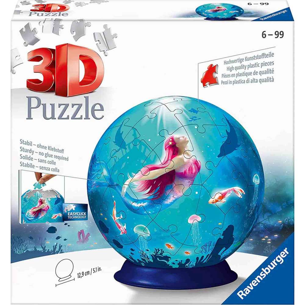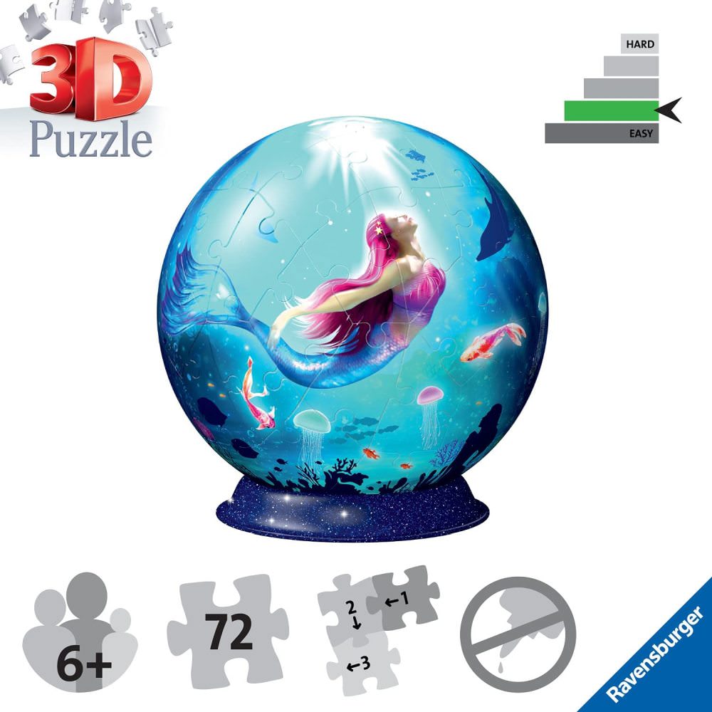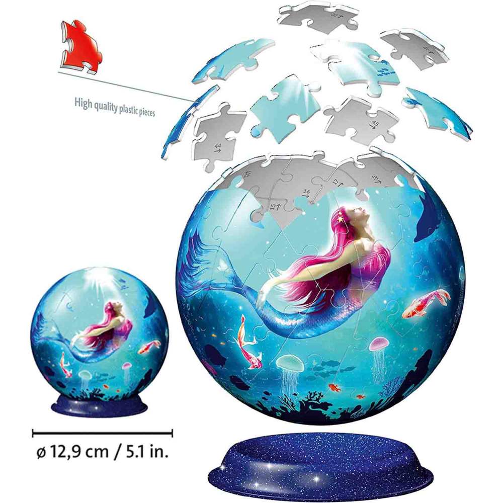 Cu aceasta minge de puzzle 3D va puteti cufunda in minunata lume subacvatica a sirenelor! Distractie de puzzle si un decor minunat pentru camera copiilor garantat! Aceasta bila de puzzle 3D stabila este creata bucata cu bucata din piese de puzzle din plastic curbat care se potrivesc perfect datorita tehnologiei Easyclick, fara lipire.