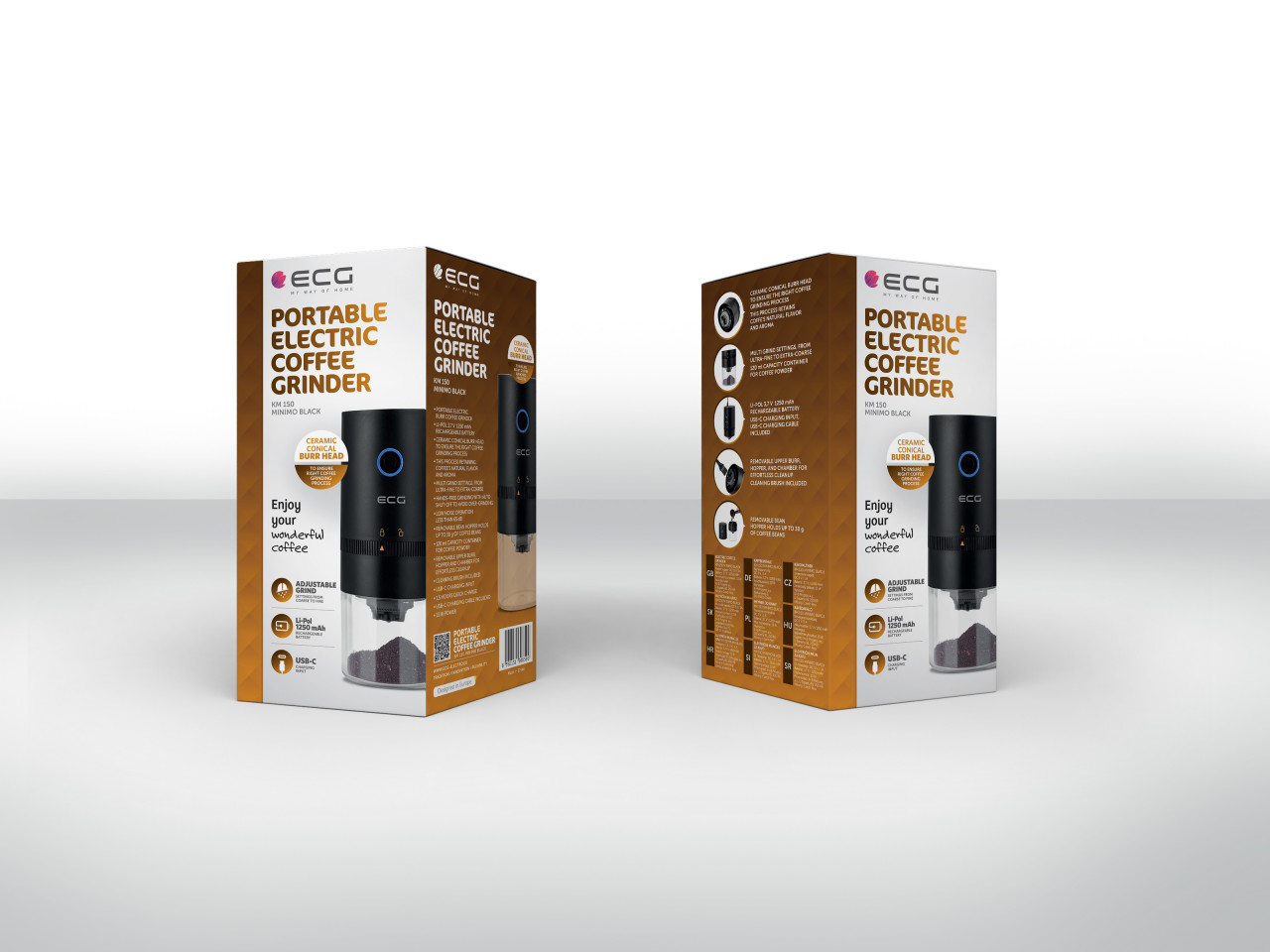 Cafea proaspat macinata oricand si oriunde ECG KM 150 Minimo te va incanta cu gustul si aroma cafelei proaspat macinate nu doar acasa, ci si in calatoriile tale. Aceasta rasnita electrica portabila are dimensiuni compacte si functioneaza cu bateria incorporata, ceea ce inseamna ca puteti macina cafea pentru bautura preferata oriunde si oricand. Datorita sistemului cu pietre conice din ceramica, ECG KM 150 Minimo macina foarte fin boabele de cafea. Rezultatele vor multumi chiar si pe cei mai pretentiosi bautori de cafea. Calatorie cu aroma de cafea Daca iti place sa calatoresti si esti un pasionat de cafea buna, rasnita electrica portabila ECG KM 150 Minimo ar trebui sa isi aiba locul permanent in valiza sau rucsac. Este practic facuta pentru calatorii. Datorita designului sau minimalist, nu va ocupa prea mult spatiu in bagaj. Functioneaza cu o baterie incorporata litiu-polimer (1250 mAh), asa ca plecati la drum cu ea incarcata si o folositi unde electricitatea nu este disponibila. De asemenea, functionarea silentioasa (mai putin de 65 dB) nu deranjeaza niciodata pe cei din jurul tau. Aparatul este prevazut cu o interfata moderna pentru incarcare prin USB-C. Datorita tehnologiei de incarcare rapida nu trebuie sa asteptati foarte mult, bateria ajungand la 100% in 1,5 ore. Deoarece rasnita electrica portabila ECG este echipata cu pietre ceramice in forma conica, macina boabele de cafea cu adevarat precis si reduce temperatura in timpul procesului de macinare. Pastreaza astfel gustul si aroma naturala a cafelei. Pentru a putea prepara exact cafeaua pe care o iubesti, rasnita noastra ofera si optiunea de a seta exact gradul de macinare – poti alege de la cafea macinata ultrafin pana la extra grosier. In containerul de umplere al rasnitei incap pana la 30 g de boabe de cafea, iar capacitatea recipientului de cafea macinata este de pana la 120 ml. Cafeaua proaspat macinata se poate folosi la prepararea in espressor, in percolatoare, in aparatele de cafea cu picurare sau in sistemele cu presa frantuzesti. Sau, cum vi se pare sa pregatiti cafea proaspat macinata, in ibric, in fata cortului ? Suna bine, nu-I asa ? Intretinere usoara Datorita componentelor detasabile curatarea acestui dispozitiv compact se face foarte usor si fara batai de cap. Peria de curatare inclusa in pachetul de baza este de mare ajutor. Pachetul contine un manual de utilizare in limba romana si un cablu cu conector USB-C , pe care il veti folosi pentru a incarca dispozitivul. Dimensiuni si greutate produs Dimensiuni si greutate ambalaj Lungime 7,4 cm Lungime 9 cm Adancime 7,4 cm Adancime 9 cm Inaltime 18,5 cm Inaltime 20 cm Greutate 0,4 kg Greutate 0,5 cm
