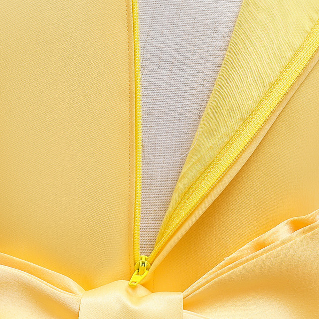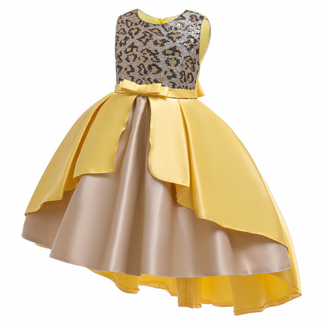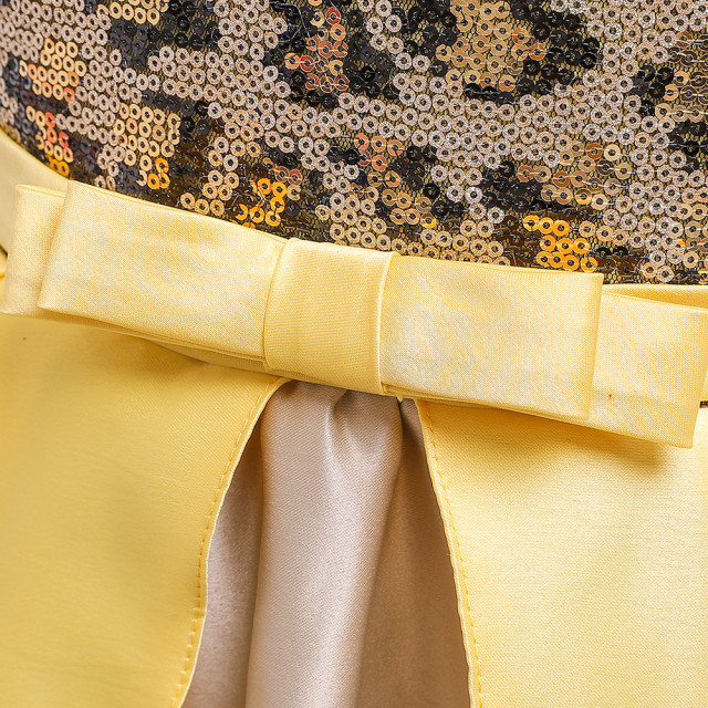 Rochie eleganta, fara manecute, cu imprimeu leopard din paiete in partea de sus si din satin galben si crem in partea de jos. Este prevazuta cu trena, se inchide cu fermoar si cordon la spate.