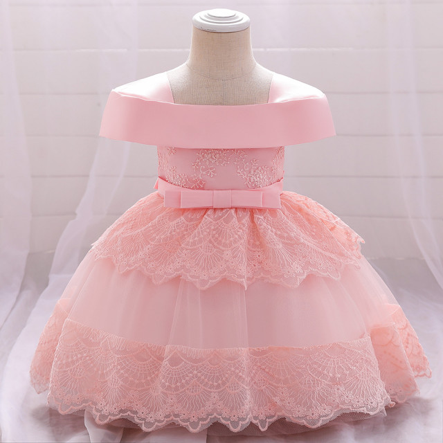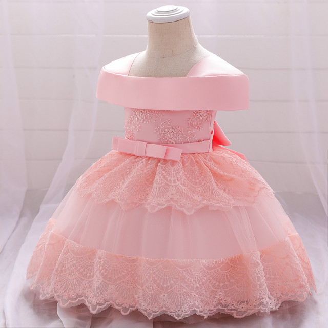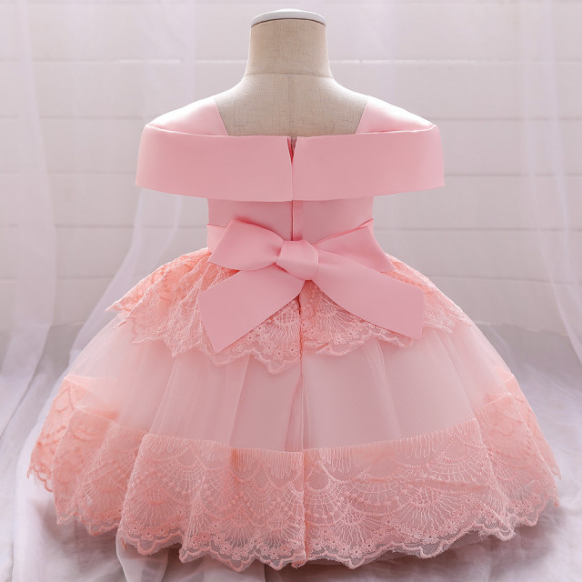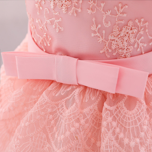 Rochita eleganta cu dantela pe poale si in talie, din saten cu broderie in partea de sus. In talie ese prevazuta cu o fundita din saten.