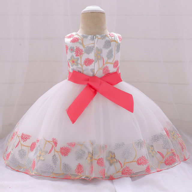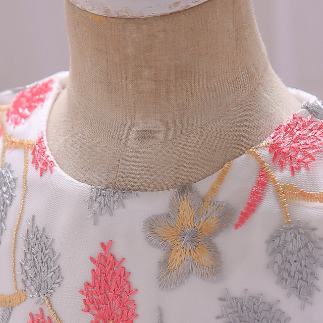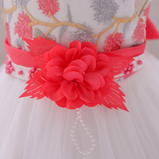 Rochita eleganta cu tul alb aplicat pe deasupra cu bordura cu flori brodate in nuante de gri si corai, asortata cu partea de sus. Are aplicate trei floricele corai din tul pe poale, iar in talie o floare detasabila. Este fara manecute si se inchide cu fermoar si cordon din saten la spate.