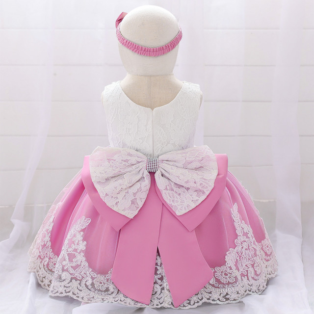Rochita eleganta din dantela alba in partea de sus si din saten roz somon cu tulle alb, cu dantela, aplicat in partea de jos. In talie este prevazuta cu cordon si o fundita in fata, iar la spate are o funda mare detasabila, cu dantela aplicata.