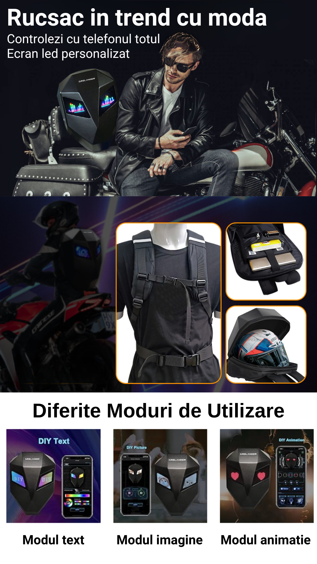 Descopera rucsacul modern care redefineste experienta de transport si stilul personalizat. Ecranul LED personalizat ofera o platforma unica pentru a-ti exprima creativitatea, cu multiple moduri de afisare care se adapteaza fiecarei situatii. Bretelele de umar confortabile, captusite cu burete, si centurile de siguranta pentru piept si talie asigura o purtare fara efort si sigura. Benzi reflectorizante iti asigura vizibilitatea in orice conditii de lumina, iar compartimentul spatios 2 in 1 permite organizarea eficienta a obiectelor si spatiu dedicat pentru casca. Construit pentru a rezista la apa, acest rucsac este partenerul ideal pentru aventuri urbane si calatorii nelimitate. O combinatie perfecta intre functionalitate, stil si inovatie!