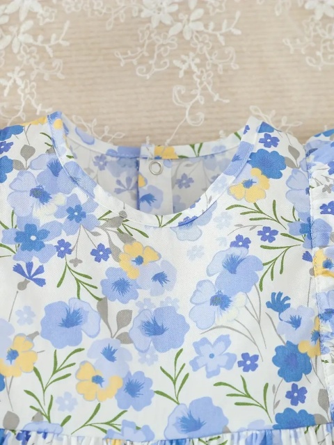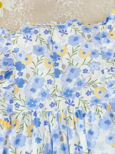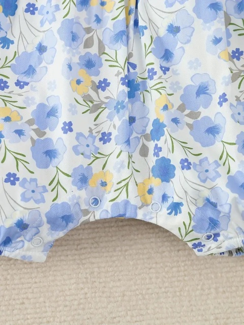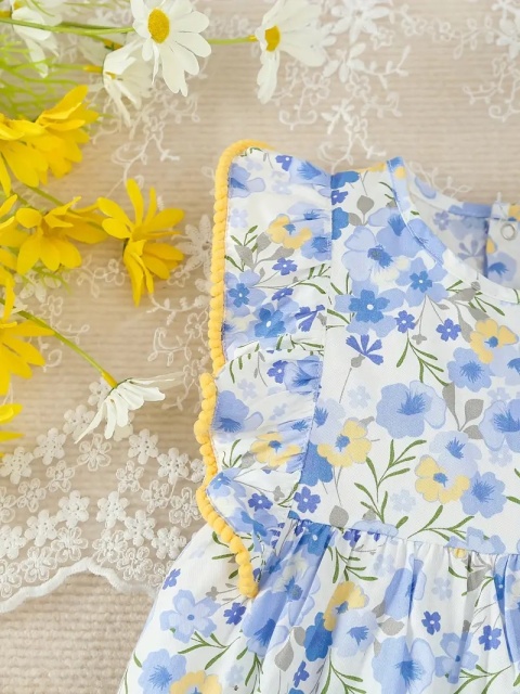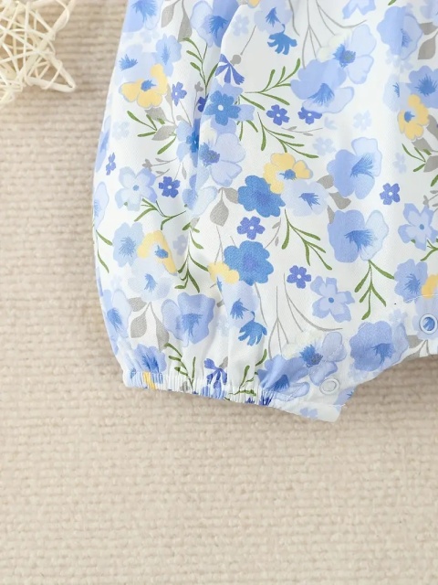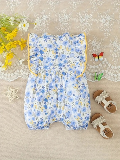 Salopeta adorabila pentru fetite, cu maneci scurte si pantaloni scurti, cu imprimeu inflorat in nuante de bleu si galben pal.