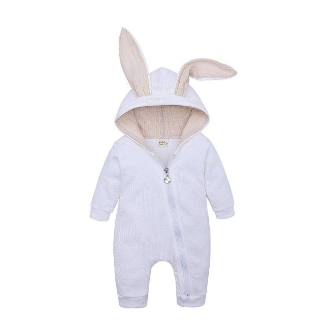Salopeta pentru bebelusi, fara botosei, se inchide cu fermoar pe mijloc. Este prevazuta cu gluga cu urechiuse de iepuras.