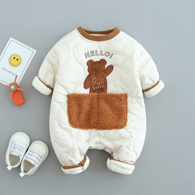Salopeta pentru baietei, din fas, captusita pe interior cu polar, fara gluga si fara botosei. Se inchide cu capse pe umar si intre picioruse. Are aplicat un buzunar din blanita si un ursulet dragalas