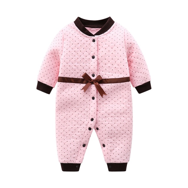 Salopeta pentru bebelusi, matlasata, de culoare roz cu detalii maro inchis si funda decorativa in talie.