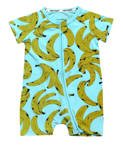 Salopeta turcoaz pentru bebelusi, cu maneca scurta, imprimata cu banane verzi, se inchide cu fermoar pe mijloc.