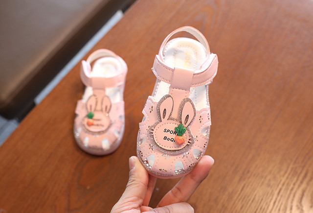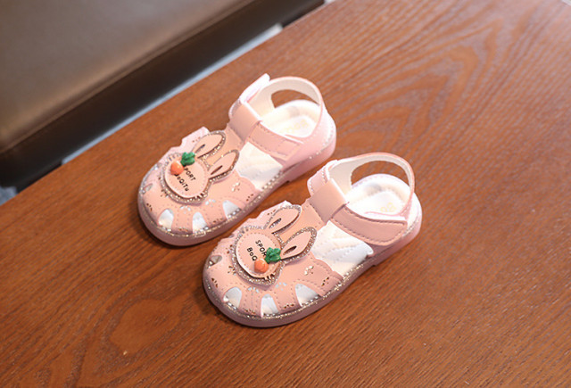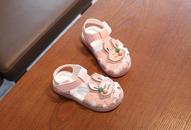 Sandale pentru fetite, din material tip piele ecologica, inchise cu barete in fata, cu un iepuras cu slipici pe margini aplicat. Se inchid cu bareta cu arici intr-o parte.