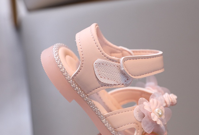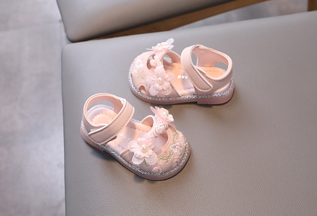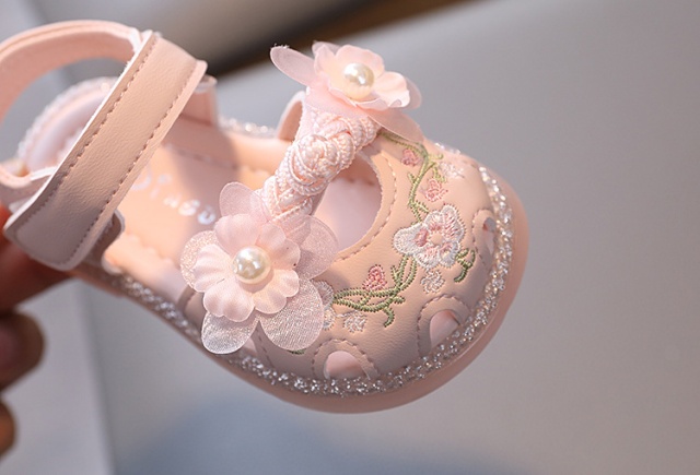 Sandale roz cu flori brodate si perlute pentru fetite – elegante si