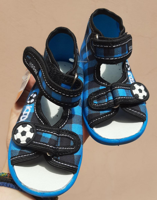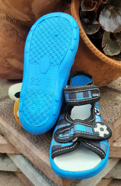 Sandalute in carouri albastre si o mingiuta din cauciuc aplicata si cu inscriptie "Kids", se inchid bareta cu arici.