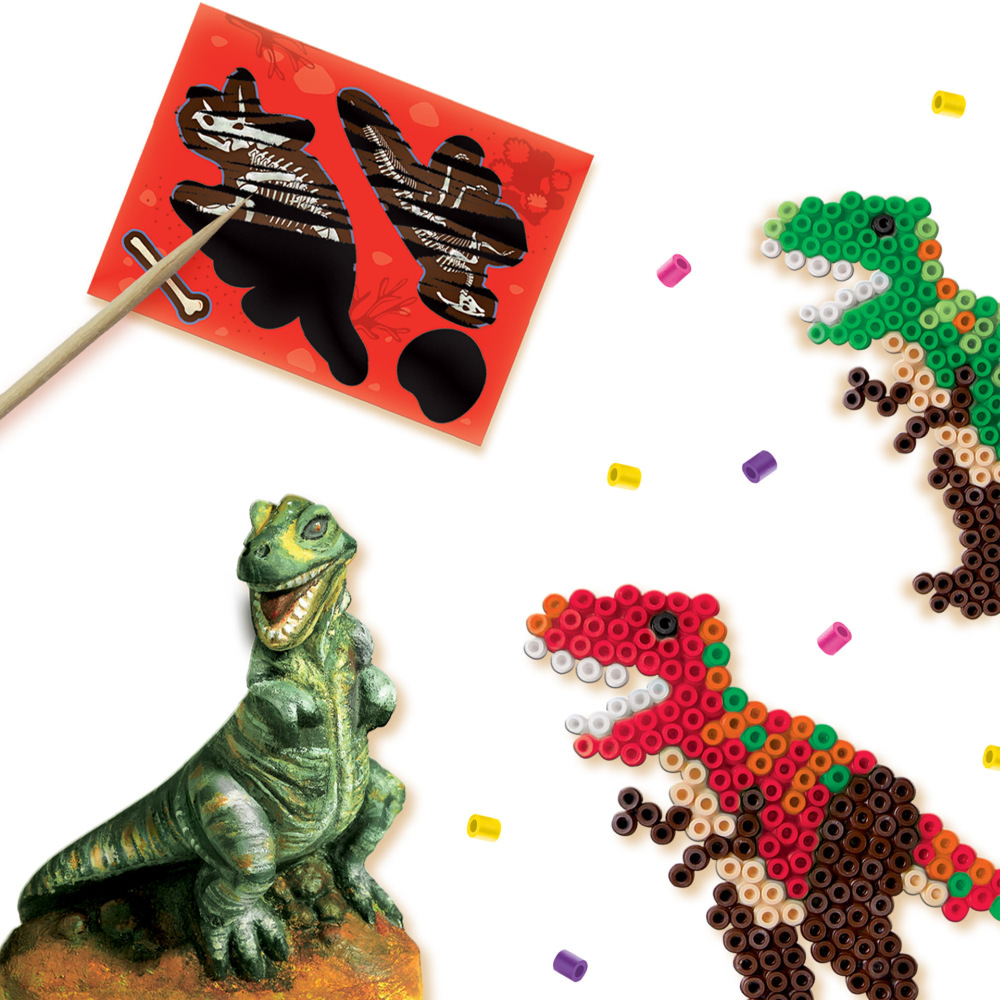 Contine: 4 carduri razuibile; pix pentru zgarieturi; T-Rex placa de calcat cu margele; 1200 margele; hartie de calcat; forma pentru ipsos T-Rex; ipsos (300 gr); set piepteni; pensula; 6 culori de acuarele; burete.