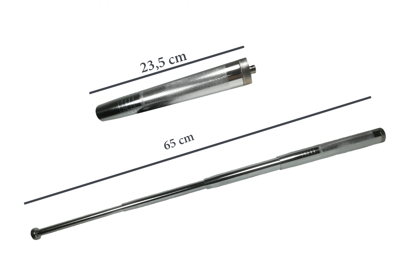 Baston telescopic pentru autoparare, alcatuit din patru elementi de otel, care se extind usor si se strang usor, cu sistem de inchidere magnetica.