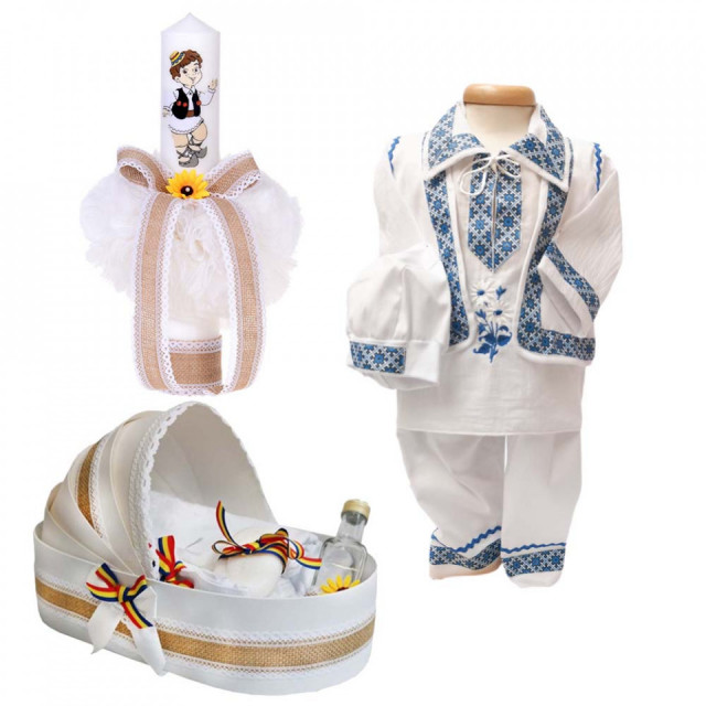 Set botez national baietel, trusou botez landou, lumanare si costum popular