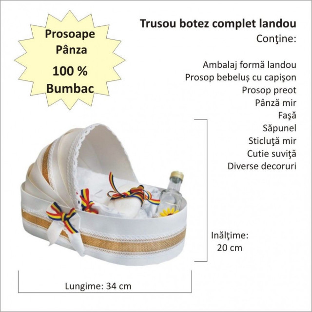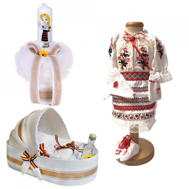 Set special creat pentru ceremonia de botez. Setul este alcatuit din trusou complet ambalat intr-o cutie tip landou decorata tradional, o lumanare asortata si un costum botez traditional fata cu decor traditional realizat din materiale de cea mai buna calitate (100% bumbac).
