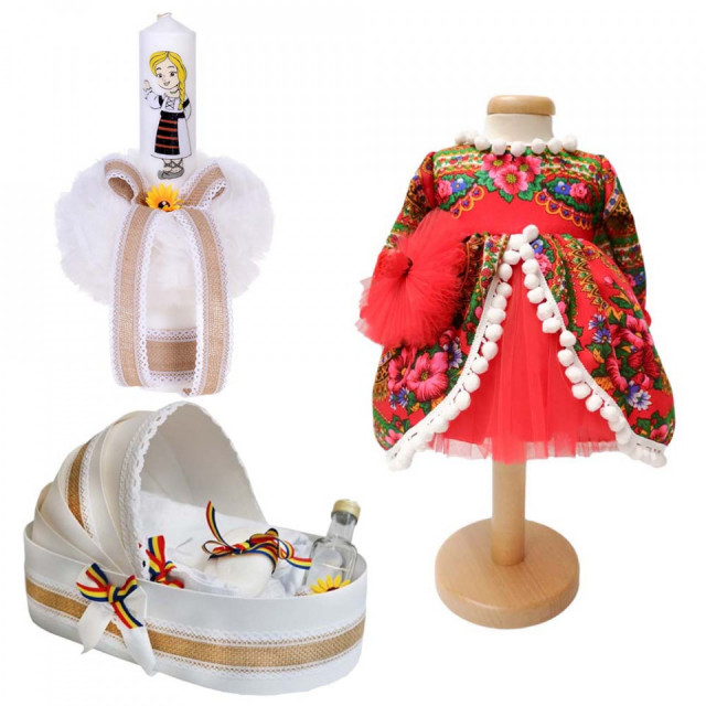 Set botez traditional fetita, trusou botez landou, lumanare si costum