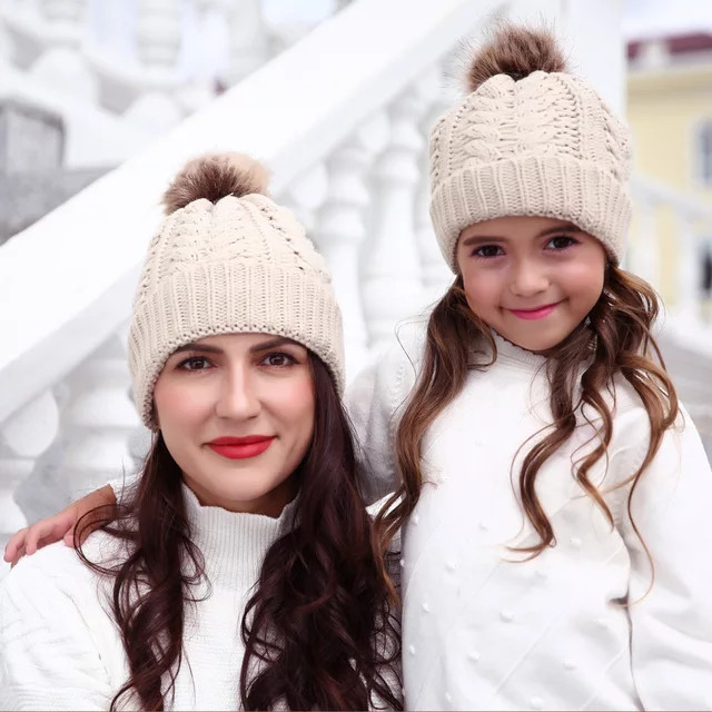 Set caciulite pentru mama si bebelus, cu model din tesatura, prevazute cu ciucure din blanita.