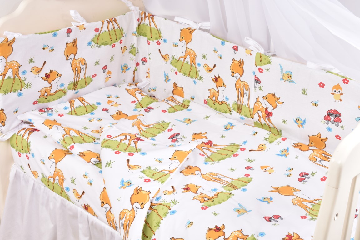 Lenjeria model Caprioare este realizata din bumbac 100%, moale, dens si foarte placut la atingere, certificat si sigur pentru copii inca de la nastere.Lenjeria contine 7 piese, astfel ca setul va avea: