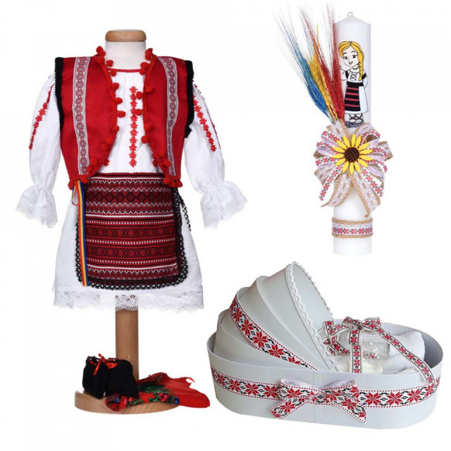Set costum national fata, trusou botez landou si lumanare, decor popular,