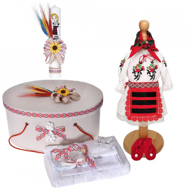 Set special creat pentru ceremonia de botez. Setul este alcatuit din trusou complet, o cutie pentru transportul trusoului si a hainutelor de botez, o lumanare botez decorata traditional si o rochita de botez stil traditional, realizata din materiale de cea mai buna calitate (100% bumbac).