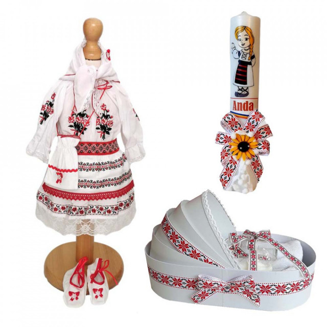 Set special creat pentru ceremonia de botez. Setul este alcatuit din trusou complet ambalat intr-o cutie tip landou decorata tradional, o lumanare asortata personalizata cu numele copilului si o rochita de botez traditional fetita cu broderie traditionala realizata din materiale de cea mai buna calitate (100% bumbac).