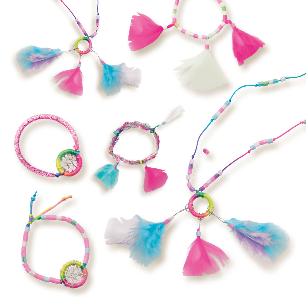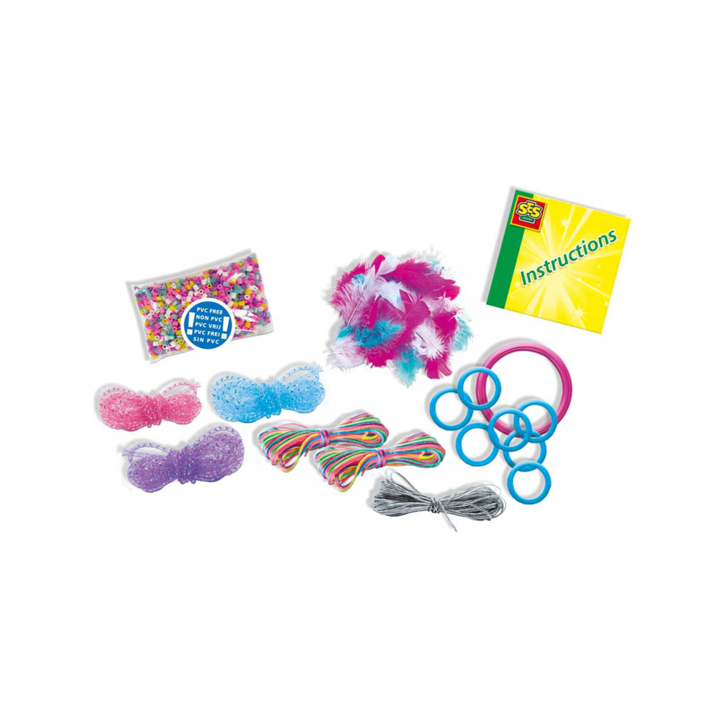 Contine: 9 inele de prins de vise; pene; 3 culori de tuburi cu sclipici; 400 margele (mixte); fir satinat multicolor; fire de broderie argintie.
