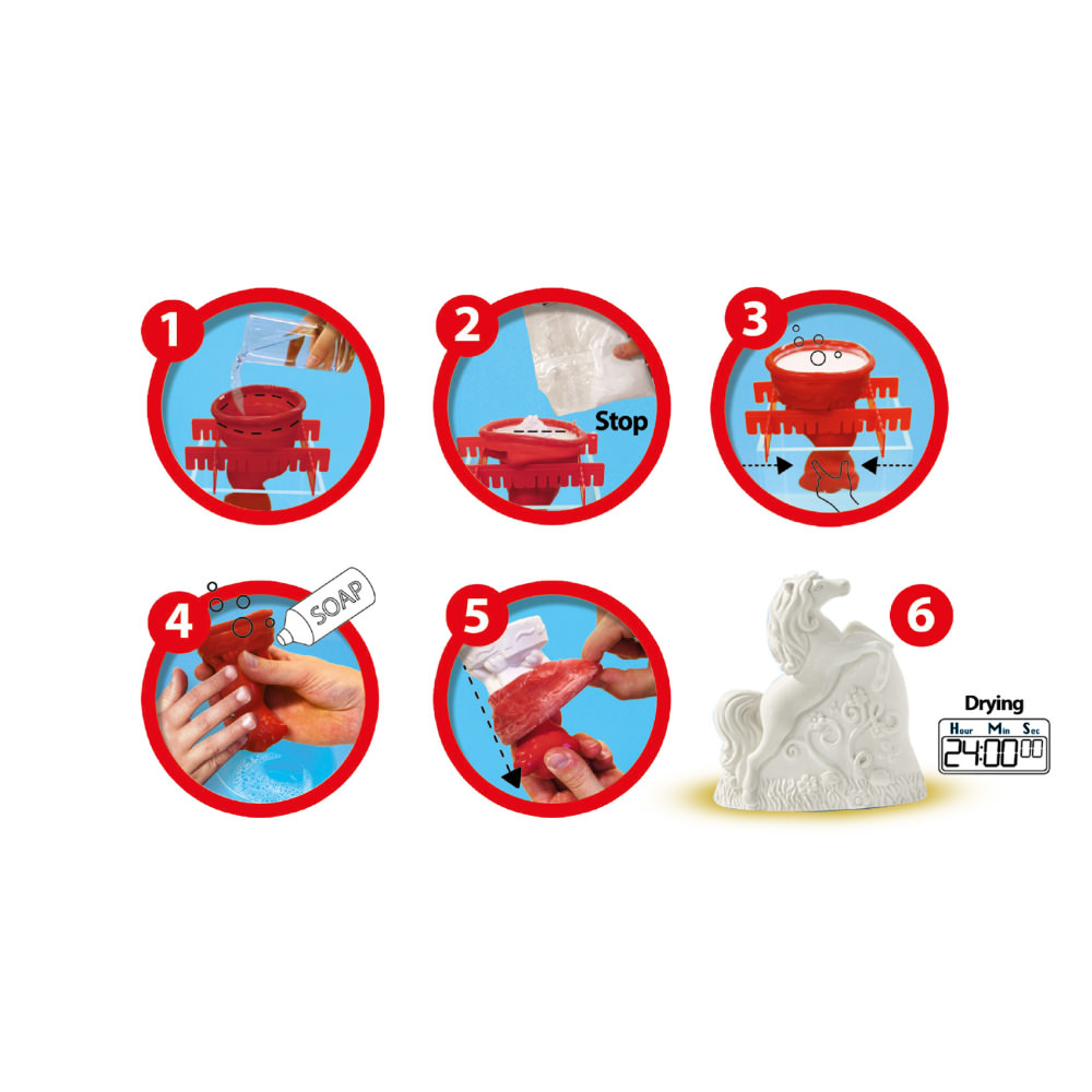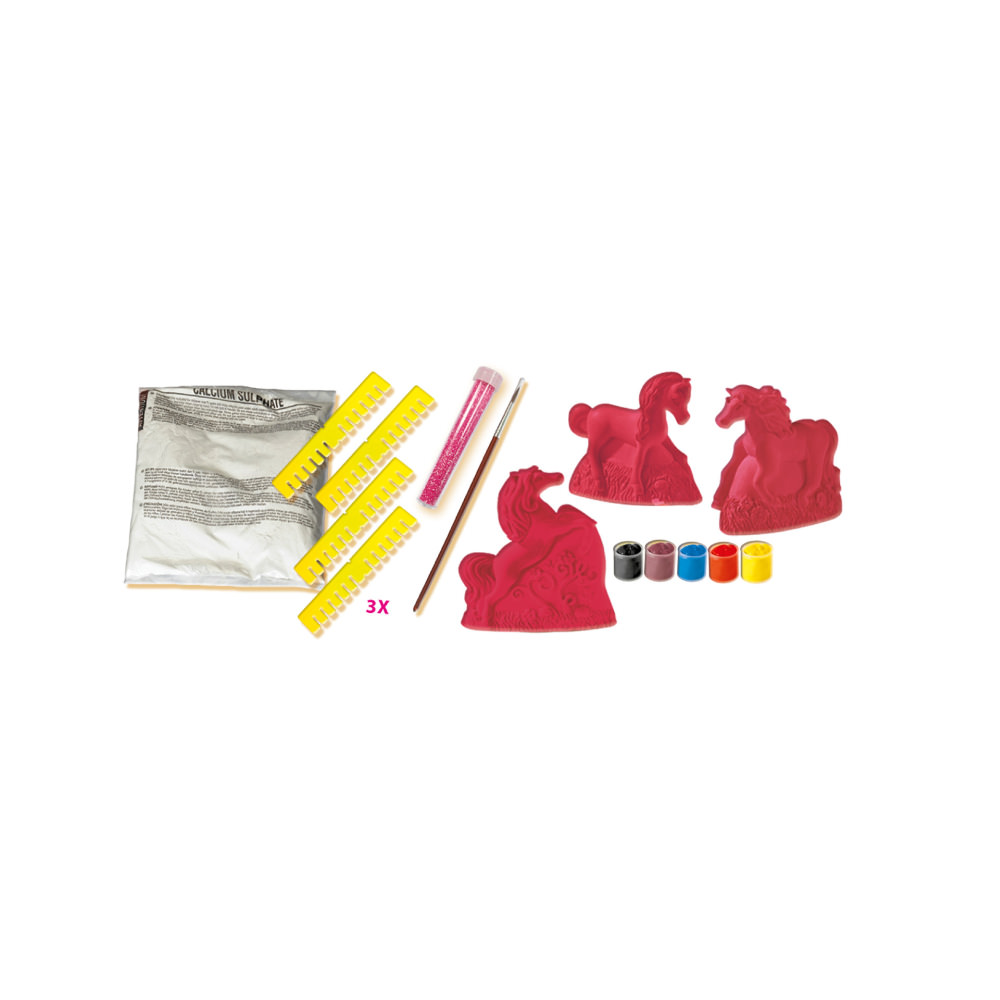 Propriile modele de cai! Cu acest set creativ le poti realiza folosind ipsos. Turnati amestecul in diferitele matrite 3D: un manz, un cal in picioare si un cal crescut. Lasati modelele sa se usuce si pictati-va caii cu acuarela inclusa in set.