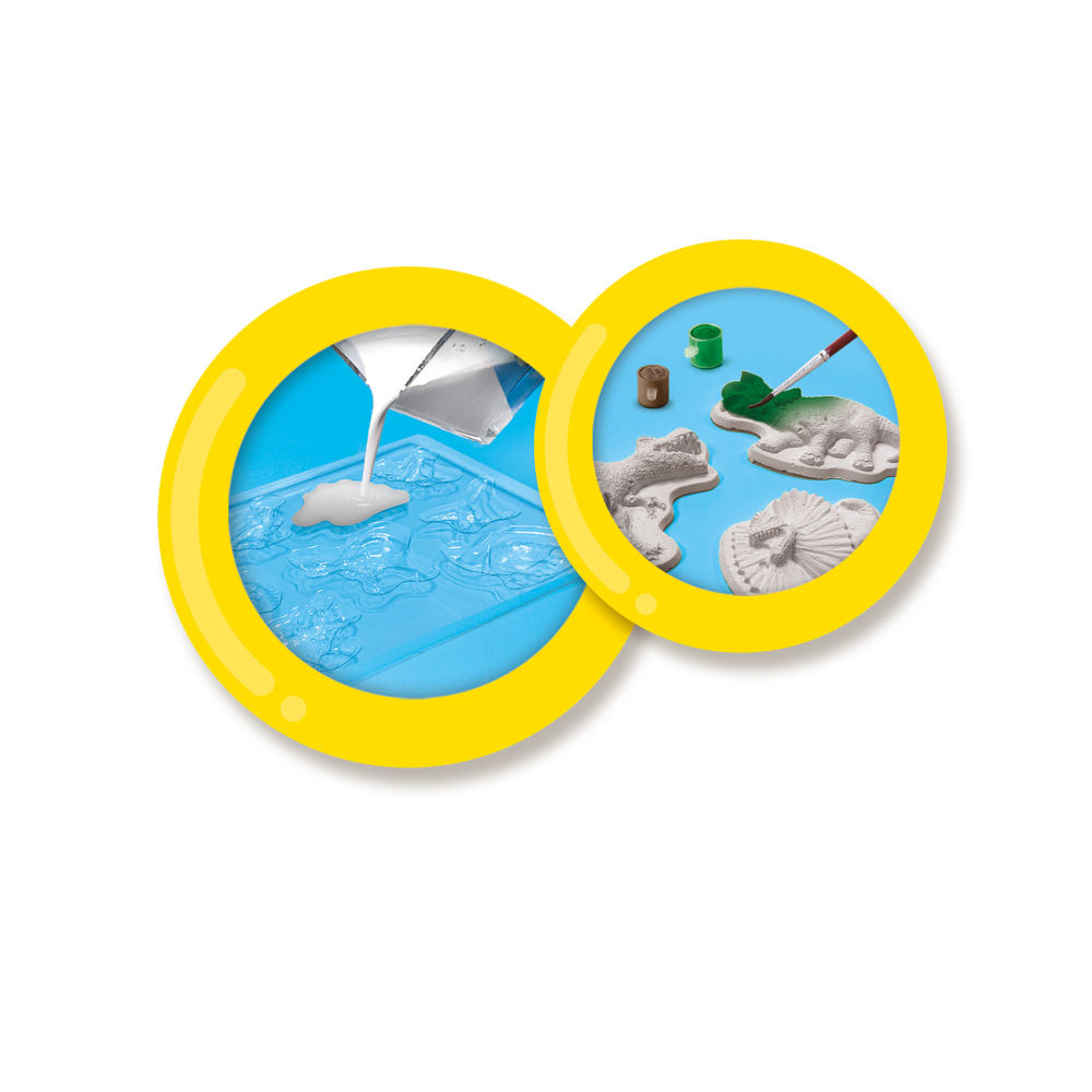 Acest set este creat special pentru toti fanii dinozaurilor. Puteti crea cu usurinta noua dinozauri diferiti amestecand pudra de modelat cu apa si turnand-o in matrita. De indata ce amestecul este tare, puteti incepe sa pictati dinozaurul in sase culori diferite.