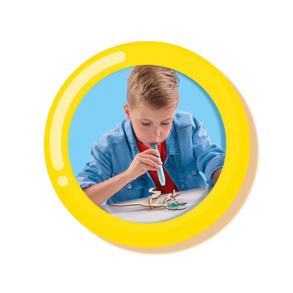 Contine: piese de dinozaur din lemn; 5 markere cu aerograf cu suflare (galben, portocaliu, violet, turcoaz, verde deschis); lipici; pensula; foaie de autocolante.