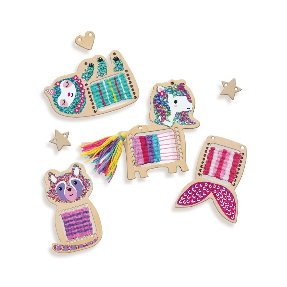 Cu aceste patru mini rame de tesut din lemn si cele sase culori de ata de brodat, poti tese patru animale mici vesele.