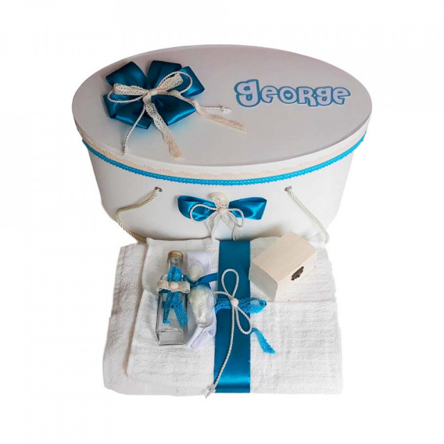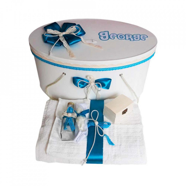 Set cutie trusou personalizata cu nume si trusou botez, decor turcoaz Denikos® 238DESCRIERE