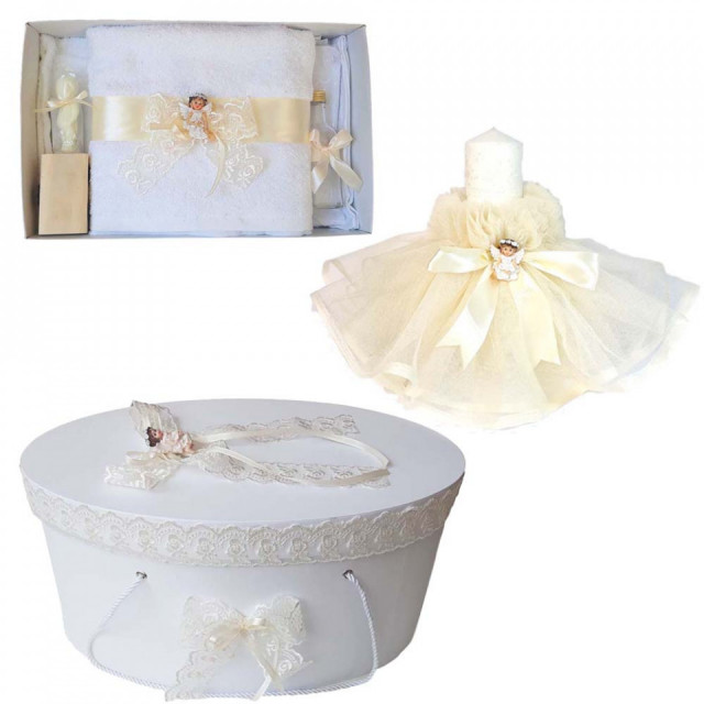 Set dantela trusou botez, cutie trusou si lumanare, ingeras, decor ivoire,