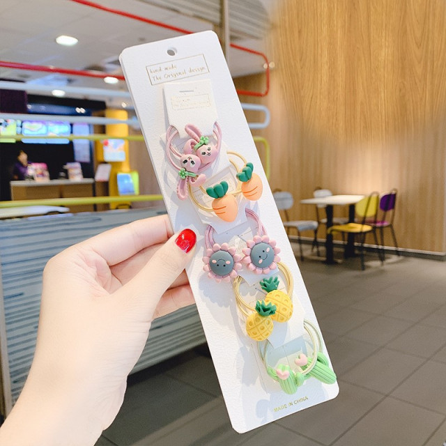 Setul contine 10 elastice pentru par, cate 2 modele pentru fiecare figurina: iepuras, morcovel, floricica, ananas, cactus