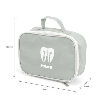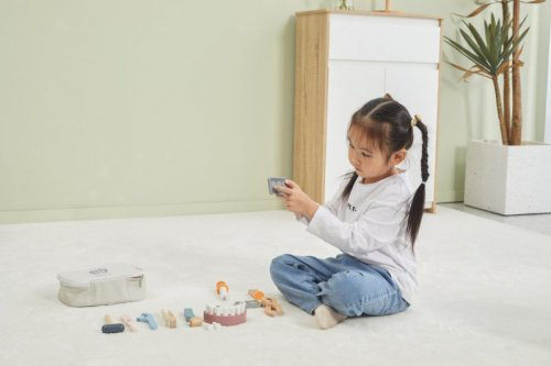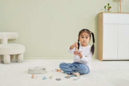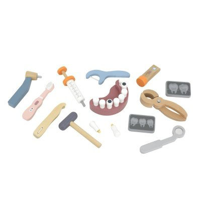 Trusa de jucarie care contine diverse instrumente folosite la stomatolog: seringa, periuta si pasta de dinti, cleste, radiografii dentare, oglinda, dinti, mandibula, ciocanel, penseta, burghiu dentar, trusa